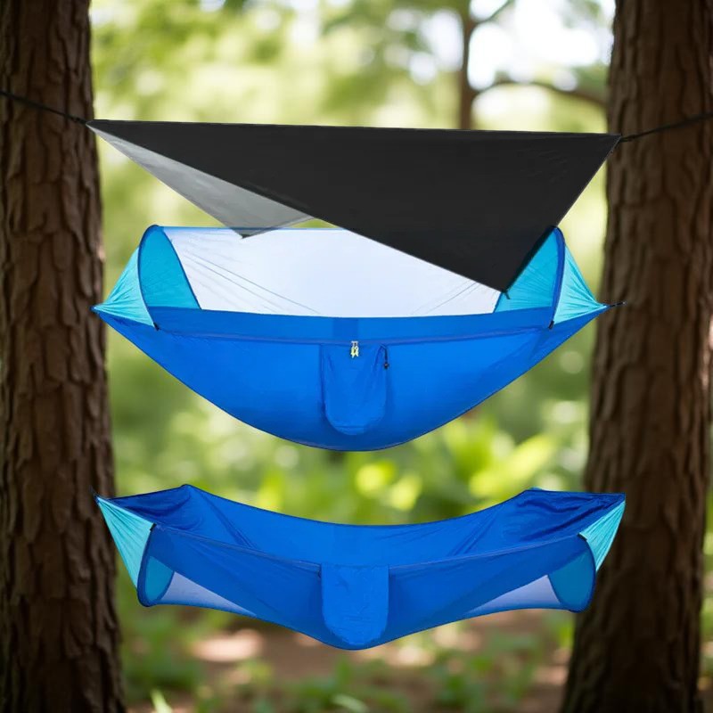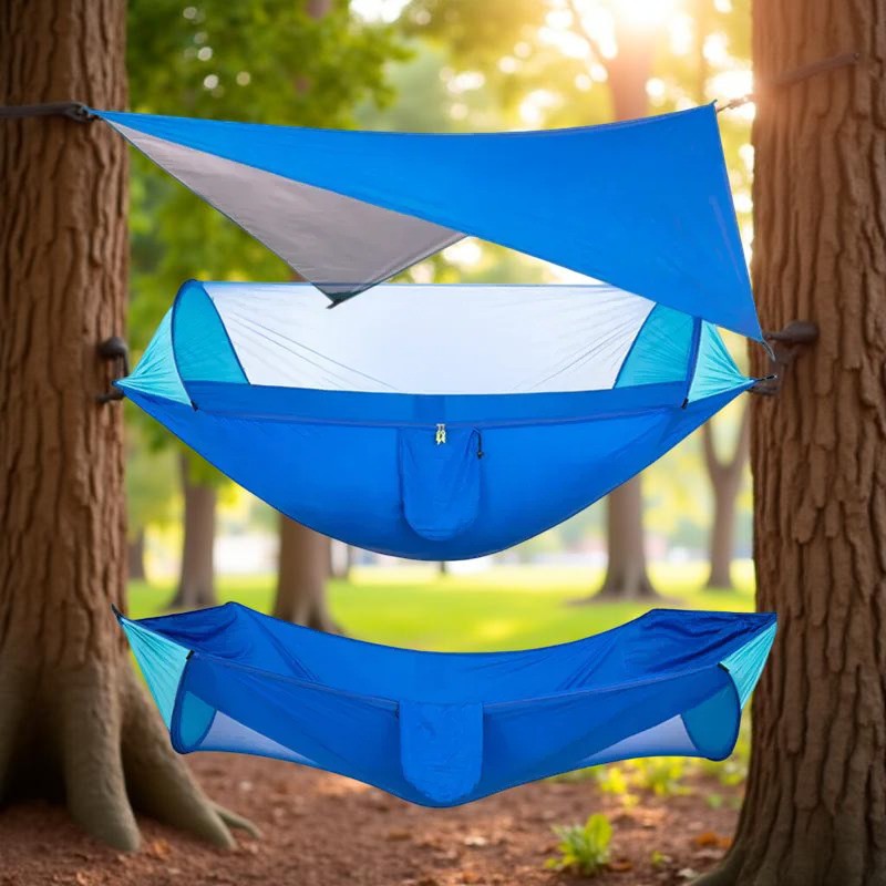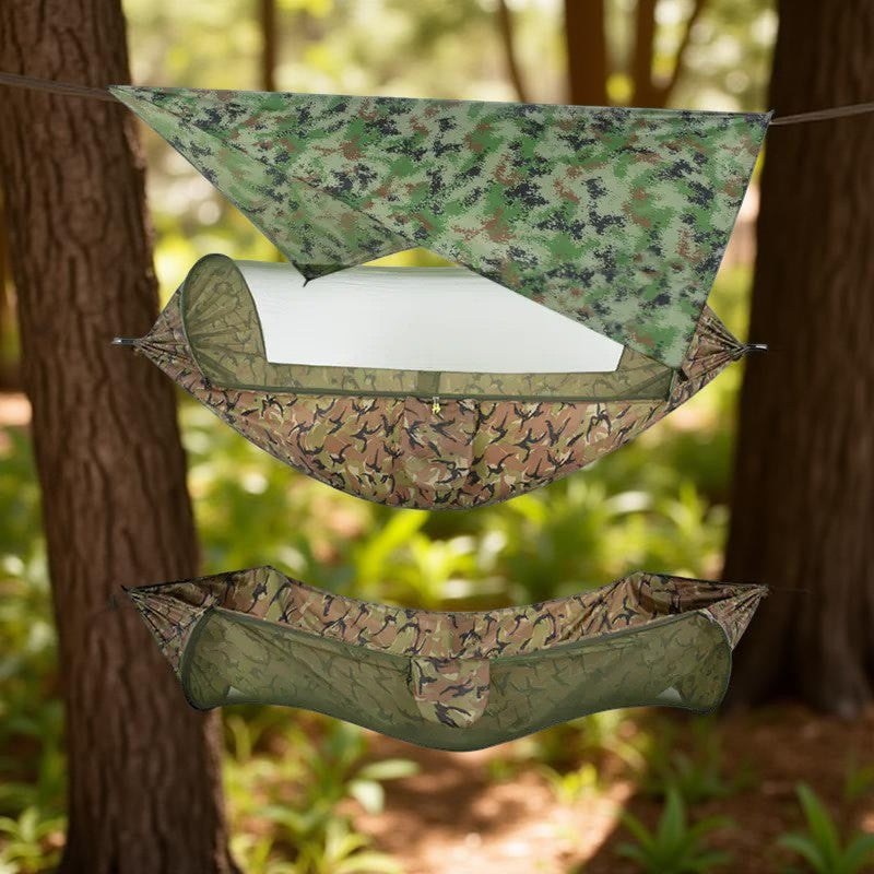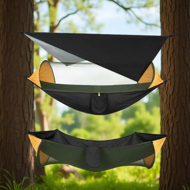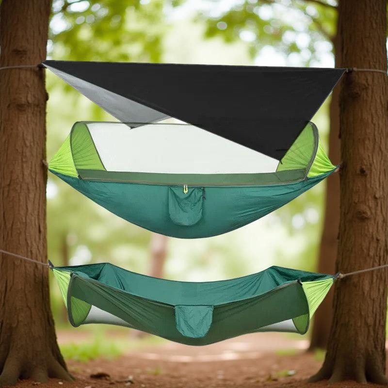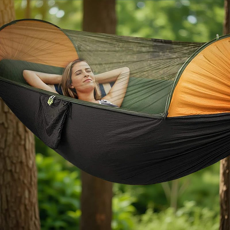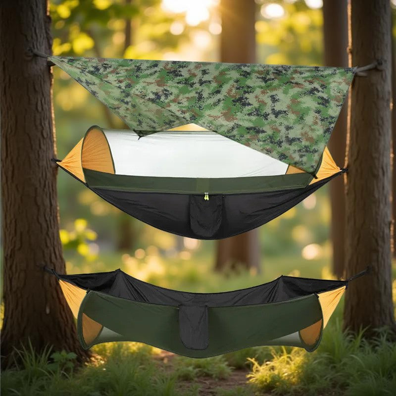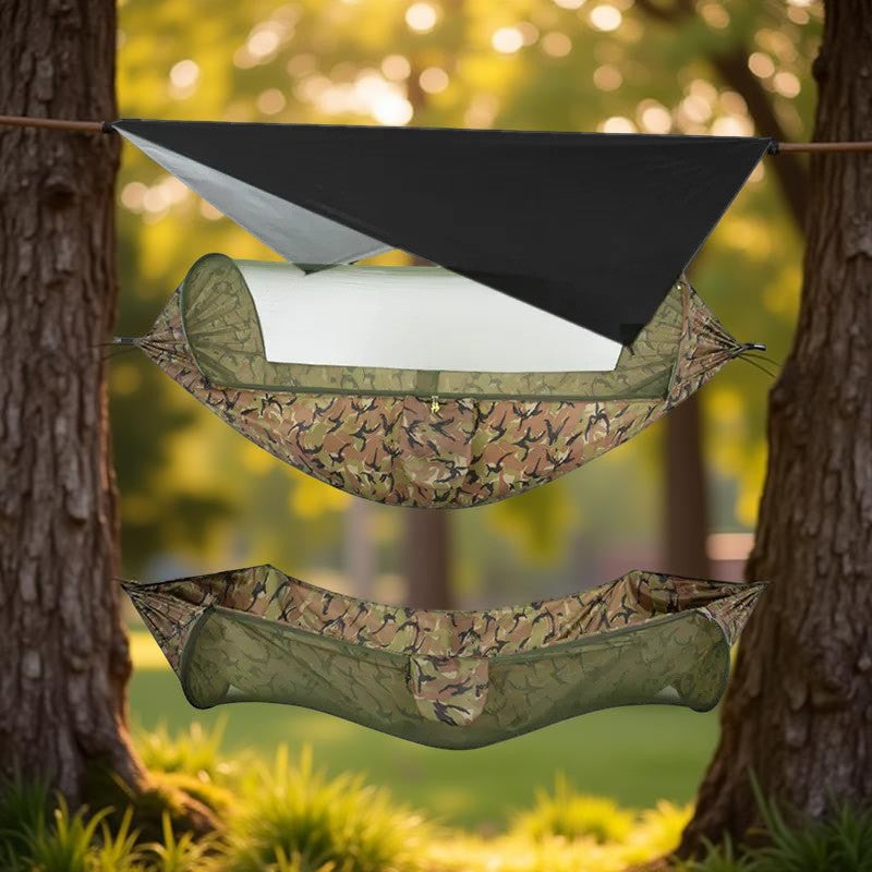 Le Hamac suspendu - AntiPluie™ transforme chaque sortie en une expérience de confort absolu, peu importe les conditions. Fini les nuits humides ou les attaques d'insectes qui gâchent vos aventures !